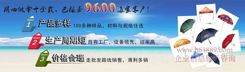 雨花石傘業有限公司是一家專注于雨傘、廣告傘、戶外太陽傘、廣告帳篷、禮品傘、等產品設計、制作、銷售為一體的綜合性企業、憑借著質量可靠、價格實惠、服務周到等優勢在市場上擁有一批穩定的客戶