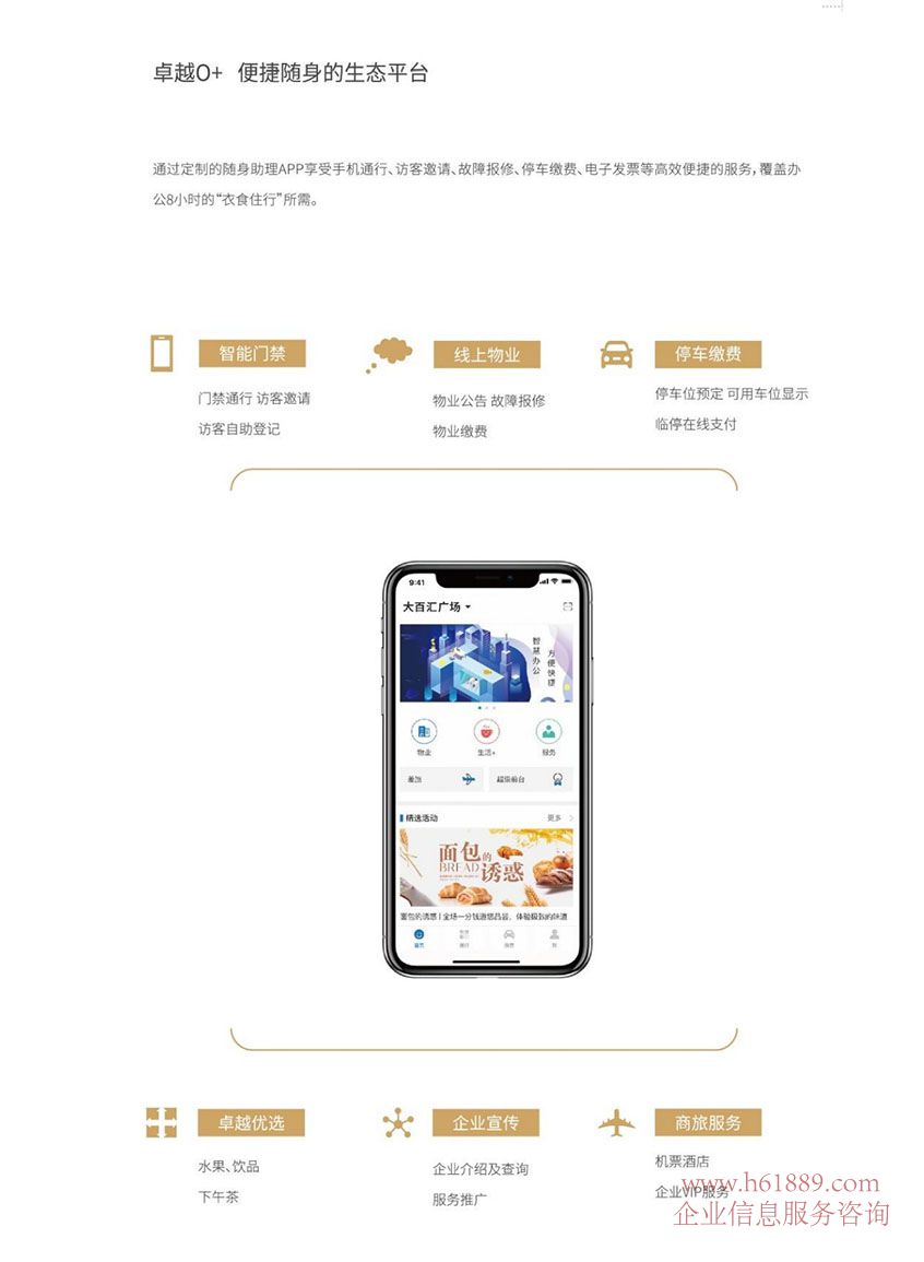 通過定制的隨身助理APP享受手機通行、訪客邀請、故障報修、停車繳費、電子發票等高效便捷的服務,覆蓋辦公8小時的“衣食住行”所需