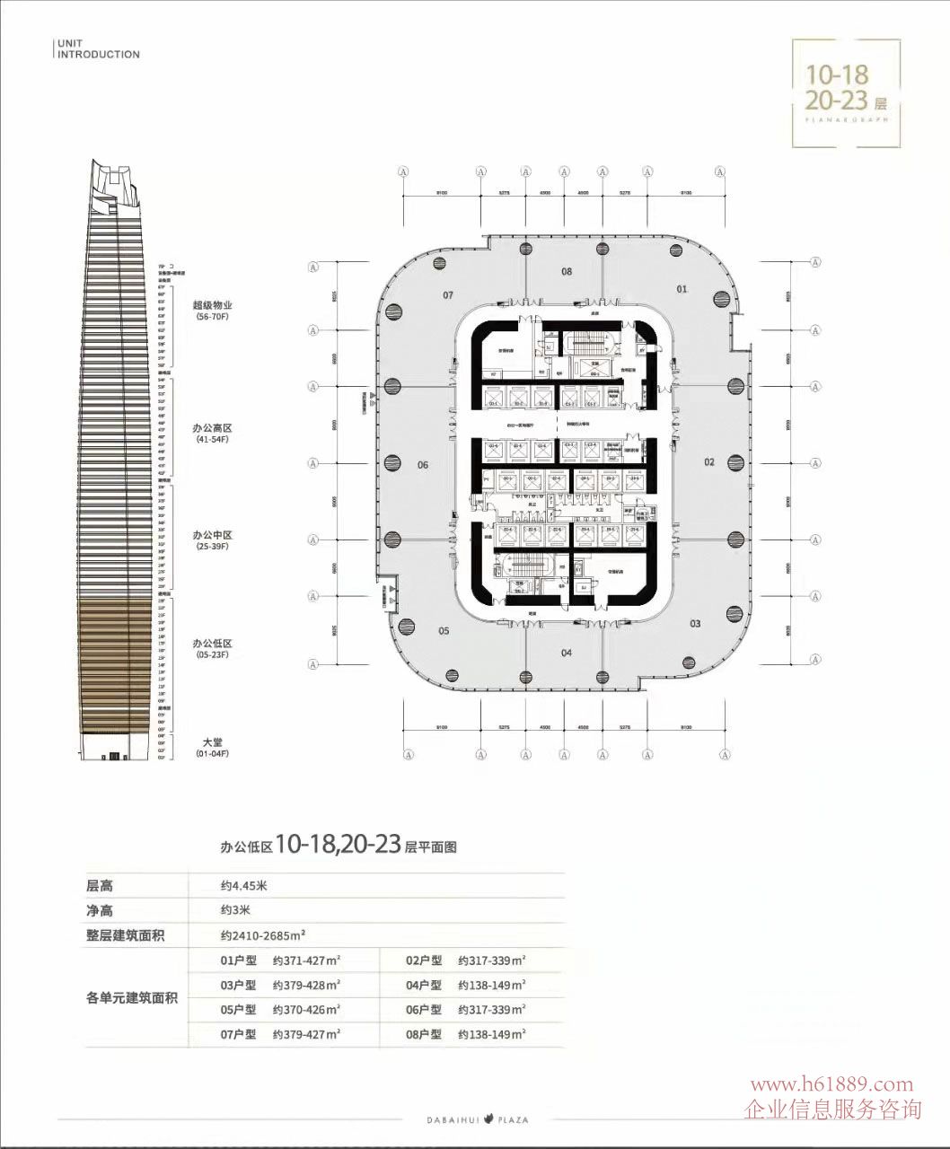 私募證券大廈【大百匯廣場】辦公低區 10到18層、20到23層平面圖、層高約:4.45米、凈高約3米、整層建筑面積約:2410平米到2685平米、各單元建筑面積: