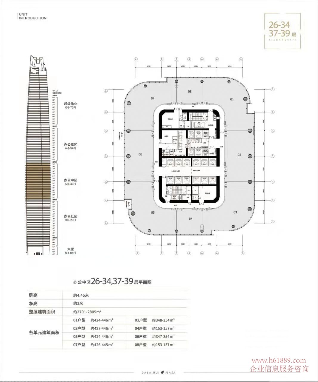 私募證券大廈【大百匯廣場】辦公中區 26到34層、37到39層平面圖、層高約:4.45米、凈高約3米、整層建筑面積約:2701平米到2805平米、各單元建筑面積: