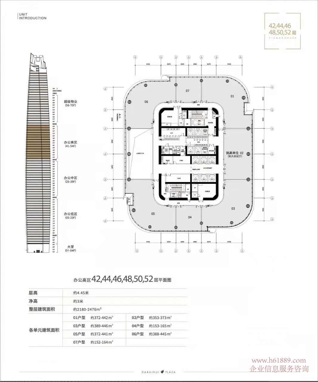 私募證券大廈【大百匯廣場】辦公高區 42層、44層、46層、48層、50層、52層平面圖、層高約:4.45米、凈高約3米、整層建筑面積約:2180平米到2476平米、各單元建筑面積: