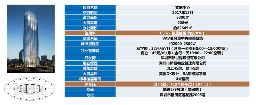 項目位于深圳市福田區新洲路與蓮花路交叉處,地上45層、地下5層;標準層面積2000㎡左右;由美國DK設計,5A甲級寫字樓;國際一級資管物業